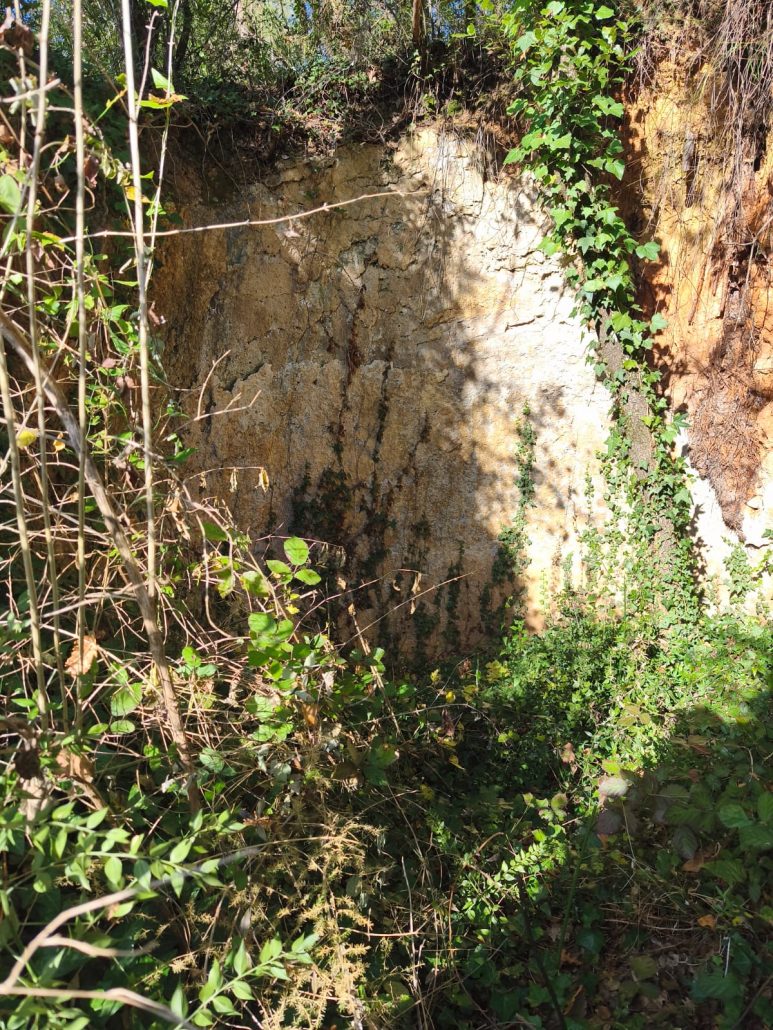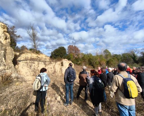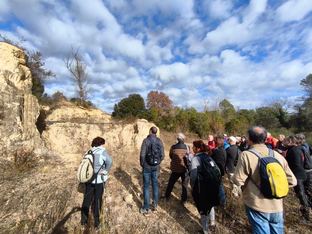 Al cap de poca estona, vam arribar a l’entrada de la pedrera de Cal Taco (motiu d’en Joan Porxas, de Crespià). Sobre el plafó indicatiu que explica què s’ha trobat en el jaciment paleontològic d’aquesta antiga activitat extractiva que havia gestionat l’empresa Incarcal, en Salvador hi va plantar el mapa geològic de la zona i ens va fer gairebé una classe magistral de geologia, tot parlant-nos de calcàries, argiles, i també de les diferents falles que hi ha a la comarca. Seguidament, vam entrar a la pedrera i ens va continuar explicant per què s’hi han pogut trobar tantes restes animals i vegetals fossilitzades. Aquí, la sedimentació dels petits fragments de calcita es va anar produint fa milions d’anys, en èpoques en què hi havia una gran abundància de fauna i flora. A partir de 1985, els arqueòlegs van començar a treballar en ferm en aquest jaciment i s’hi va arribar a excavar en nou zones. Les excavacions, actualment, es troben en un període entre campanyes, preparant-se per iniciar la propera. I tot parlant d’on poder veure algunes de les troballes que s’hi havien fet, vam encoratjar els assistents a fer una visita al nou Museu Arqueològic de Banyoles, inaugurat tot just feia dos dies, on n’hi ha exposada una bona representació.