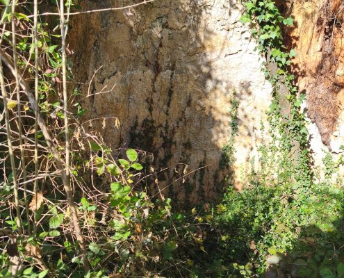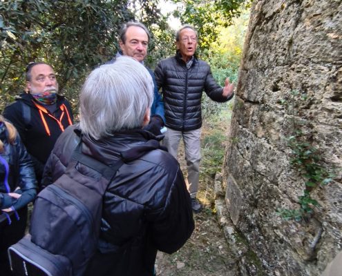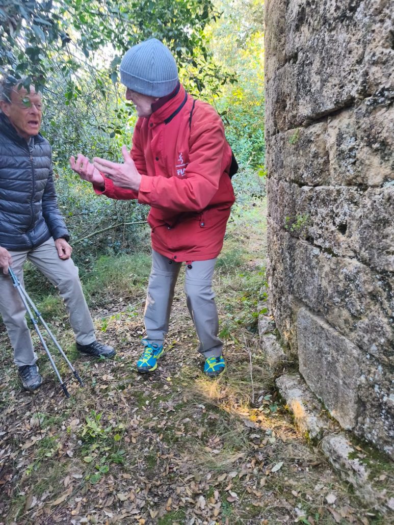 Tot seguit vam continuar camí, ara de baixada, fins arribar al nivell de les aigües del Fluvià, en l’indret anomenat la Salida. Ens vam allunyar de l’aigua tot travessant el pla de les Arenes per aturar-nos a l’inici de la pujada a observar un forn de calç. En Carles Puncernau ens va fer una bona explicació sobre el funcionament d’aquests forns, que utilitzaven com a material el carbonat càlcic, abundant a la zona. D’aquesta mena de forns, que van ser una bona ajuda per a l’economia dels pagesos durant molts anys, se n’han localitzat una vuitantena a la comarca. Tot continuant la pujada, en Salvador ens va mostrar una paret del marge amb uns curiosos plecs formats per la pressió de la gran quantitat de carbonat càlcic dipositada, un material relativament tou en estar constituït per una acumulació de fragments petits de calcita.