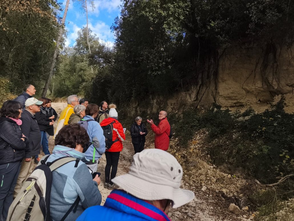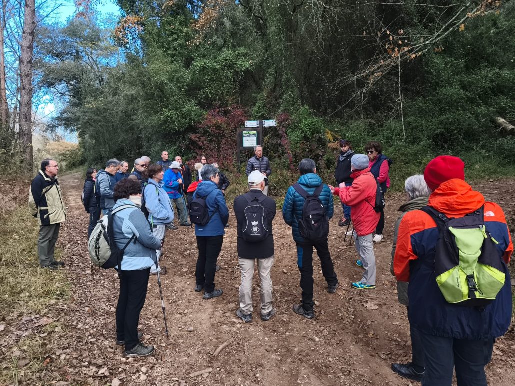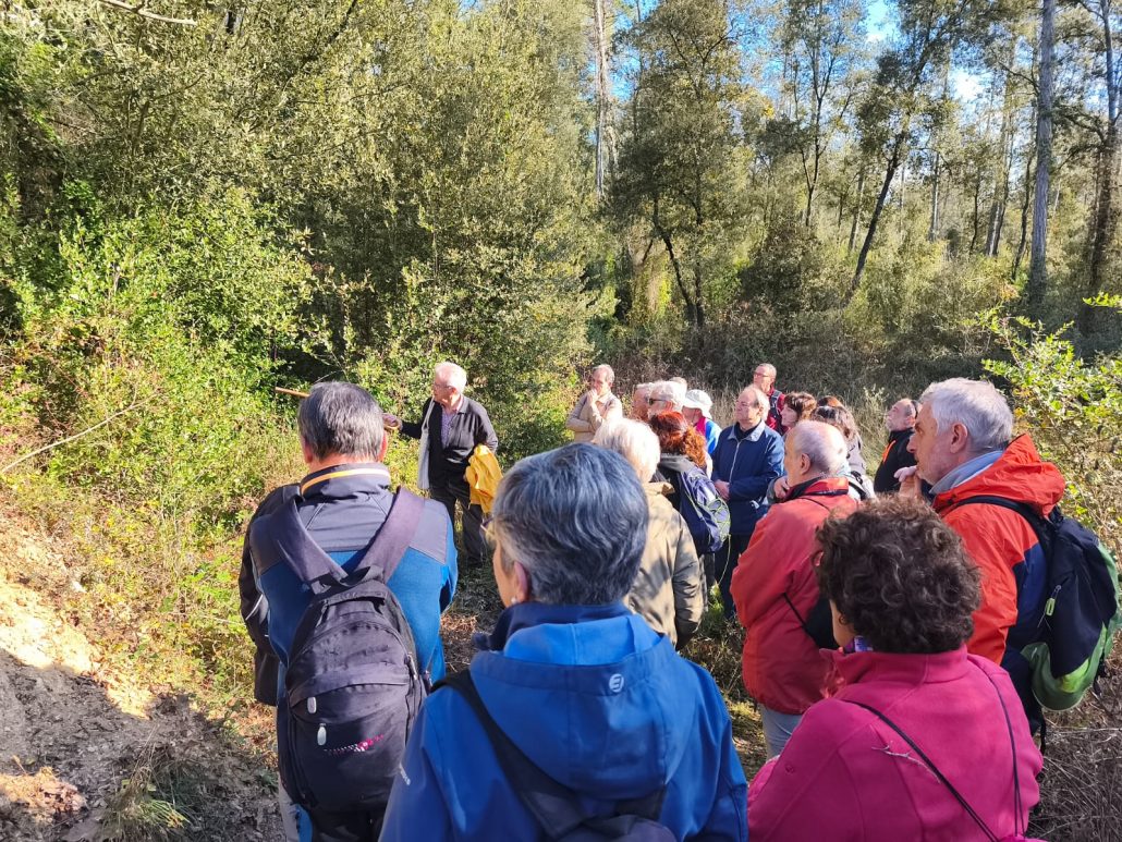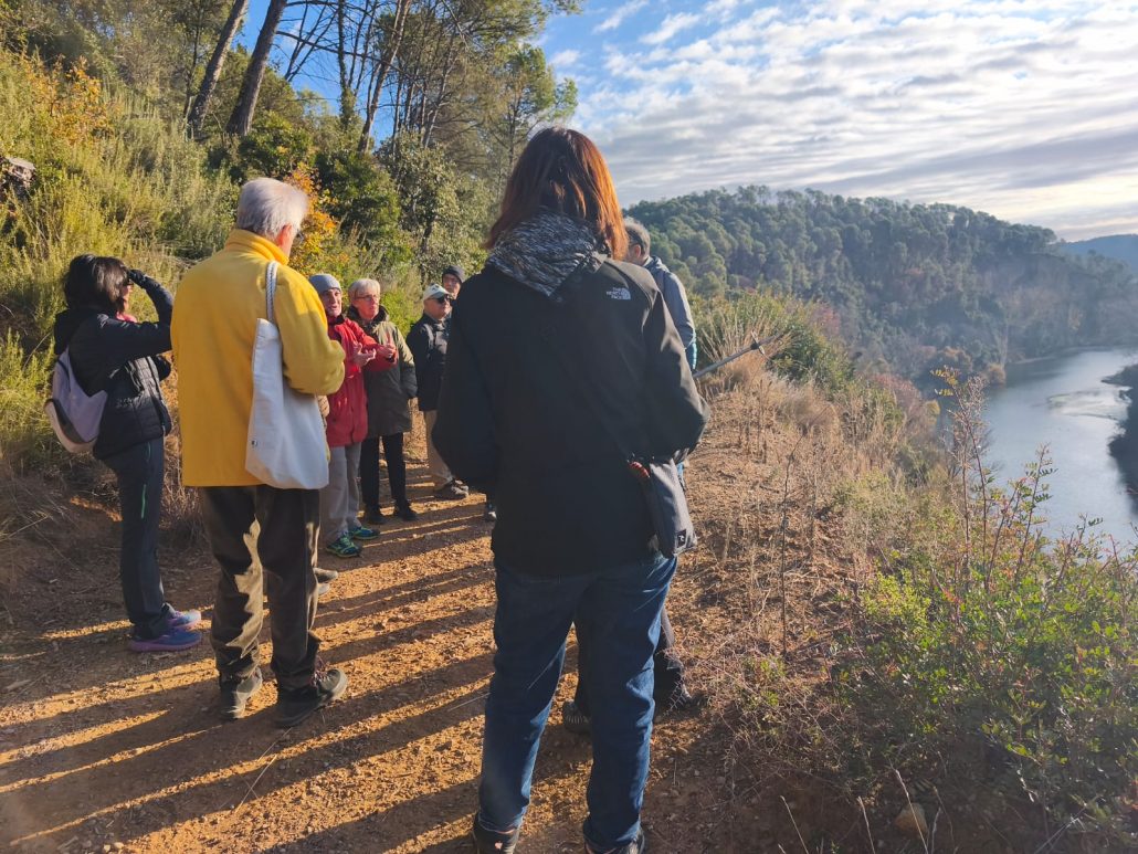 Ja a l’aparcament de la plaça Major del poble, se’ns van afegir algunes persones més fins a ser un total de vint-i-cinc. Només d’arribar, també ens havia vingut a rebre el vent glaçat de primera hora del matí característic de Crespià: l’aurella, en femení, tal i com l’anomenen els crespianencs. Per sort, quan al cap de poca estona ja gaudíem d’una panoràmica esplèndida del Fluvià des del cim de la timba, l’aire fred va desaparèixer i ens acabaria fent un dia agradable de finals de tardor. En Salvador Sarquella, mentre miràvem el riu des d’aquesta part alta del penya-segat, ens va parlar dels diferents materials geològics que hi ha a les seves ribes i ens va explicar per què en el costat on érem hi ha un estimball i en l’oposat no. En Rafel Ponsatí ens va fer un comentari sobre els diferents tipus de pins que veuríem avui, i ens va assenyalar els que teníem més propers, majoritàriament pins blancs (o bords).