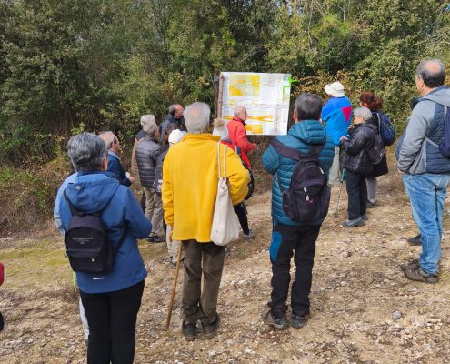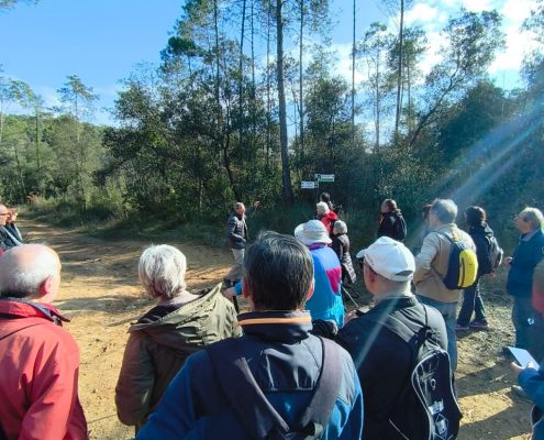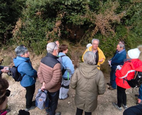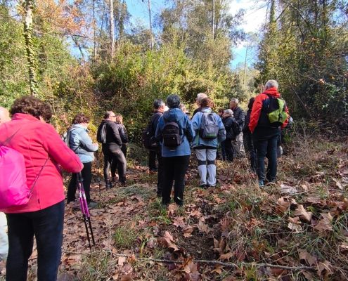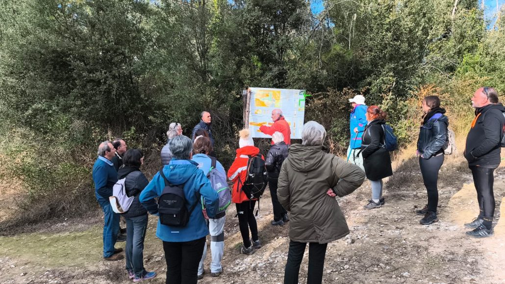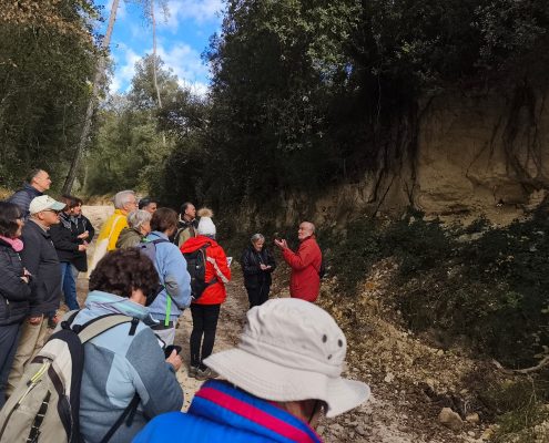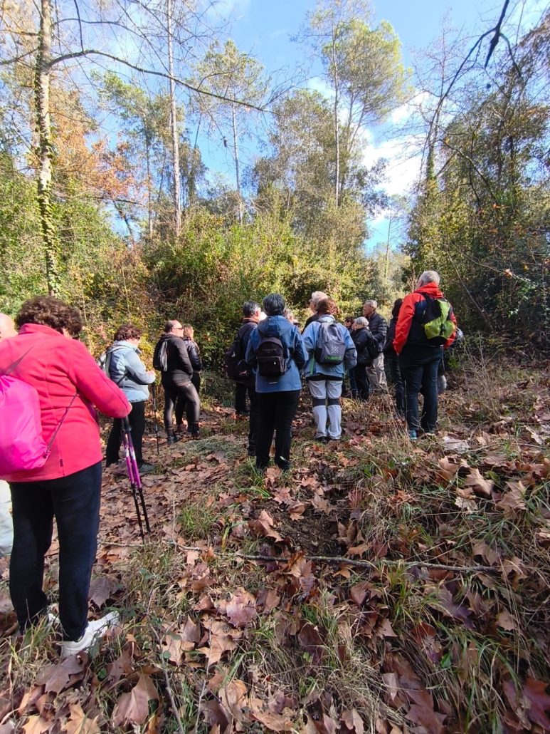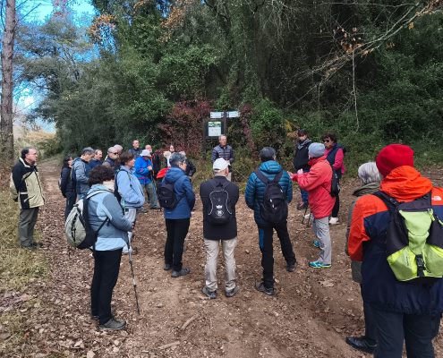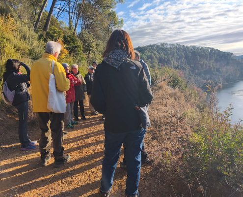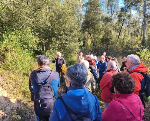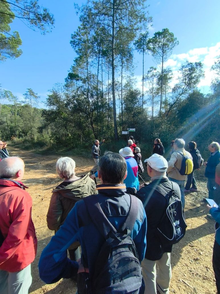 Ja a l’aparcament de la plaça Major del poble, se’ns van afegir algunes persones més fins a ser un total de vint-i-cinc. Només d’arribar, també ens havia vingut a rebre el vent glaçat de primera hora del matí característic de Crespià: l’aurella, en femení, tal i com l’anomenen els crespianencs. Per sort, quan al cap de poca estona ja gaudíem d’una panoràmica esplèndida del Fluvià des del cim de la timba, l’aire fred va desaparèixer i ens acabaria fent un dia agradable de finals de tardor. En Salvador Sarquella, mentre miràvem el riu des d’aquesta part alta del penya-segat, ens va parlar dels diferents materials geològics que hi ha a les seves ribes i ens va explicar per què en el costat on érem hi ha un estimball i en l’oposat no. En Rafel Ponsatí ens va fer un comentari sobre els diferents tipus de pins que veuríem avui, i ens va assenyalar els que teníem més propers, majoritàriament pins blancs (o bords).