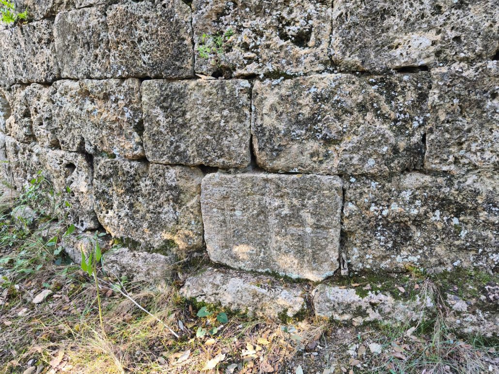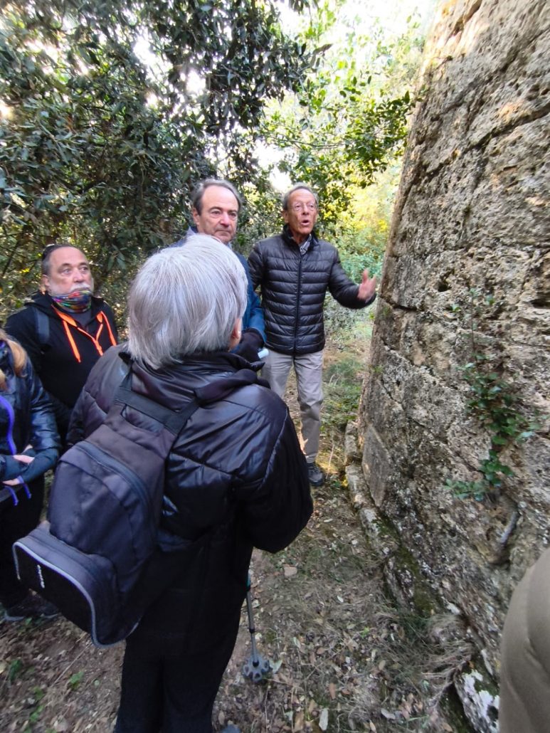 La següent parada va ser a les ruïnes de Sant Bartomeu del Portell. Aquí en Rafel ens va parlar una mica de la història d’aquesta ermita, que l’any 1828 ja constava com a totalment derruïda, i ens va comentar que la construcció havia ocupat un espai molt més gran del que podem veure en l’actualitat, envaït de bardissa. En Salvador ens va fer observar que en els carreus que encara queden dempeus hi trobem dues menes de pedra: travertí i calcària. Entre tots plegats vam mirar de localitzar una pedra on hi ha gravades tres creus. La vam trobar en la part inferior central de l’absis.