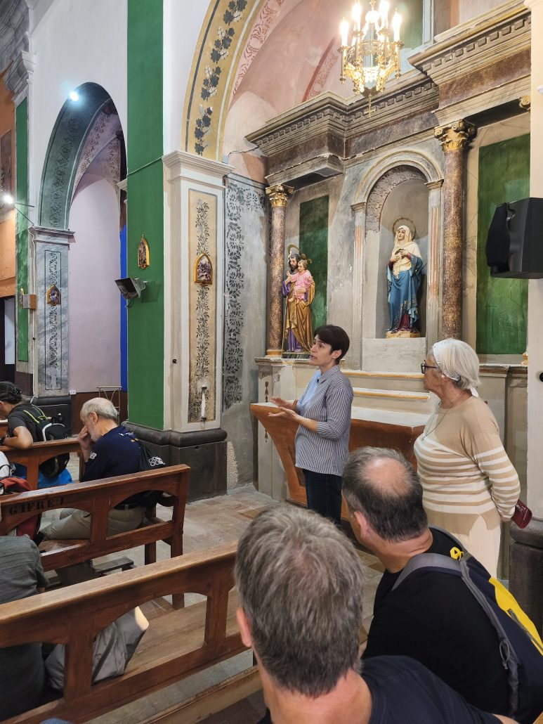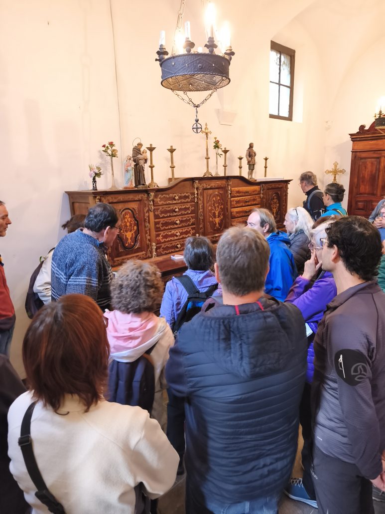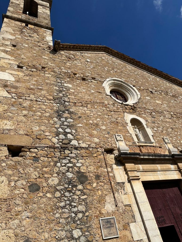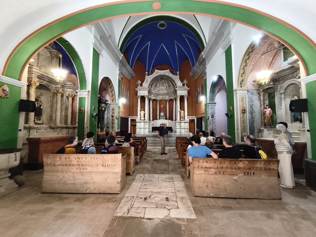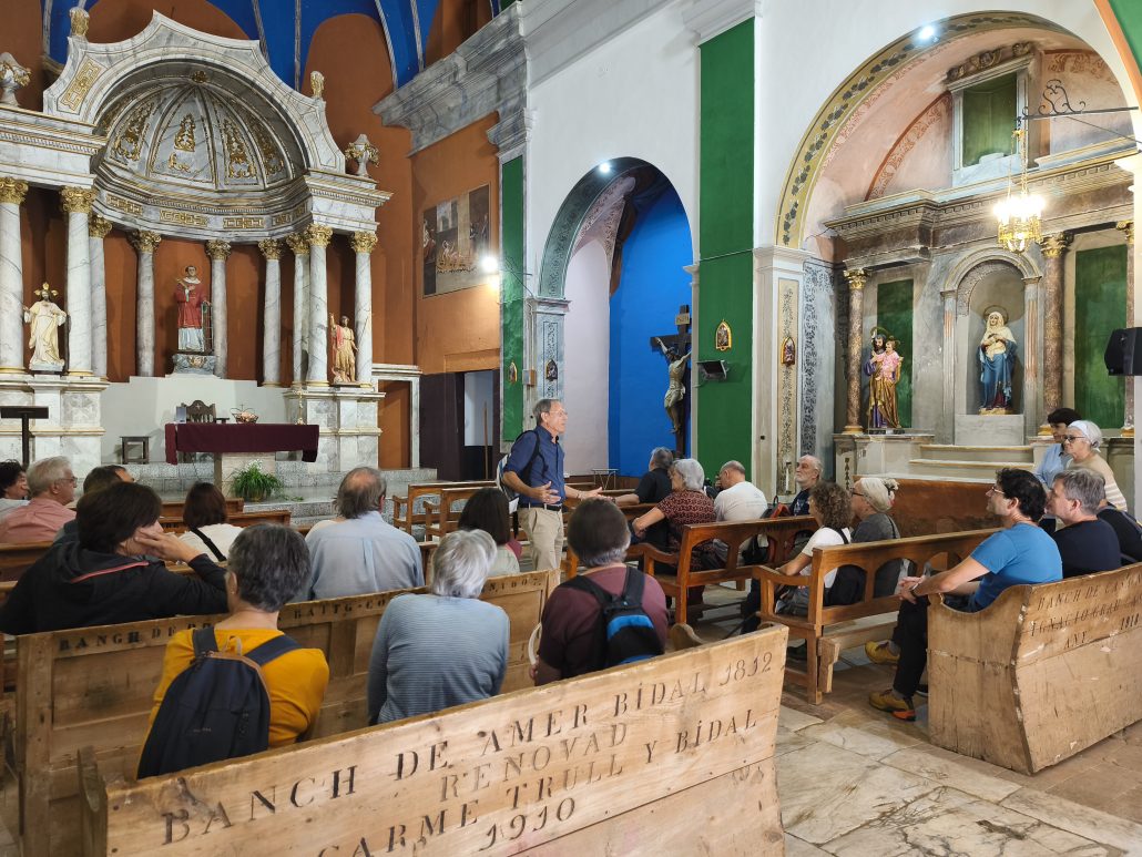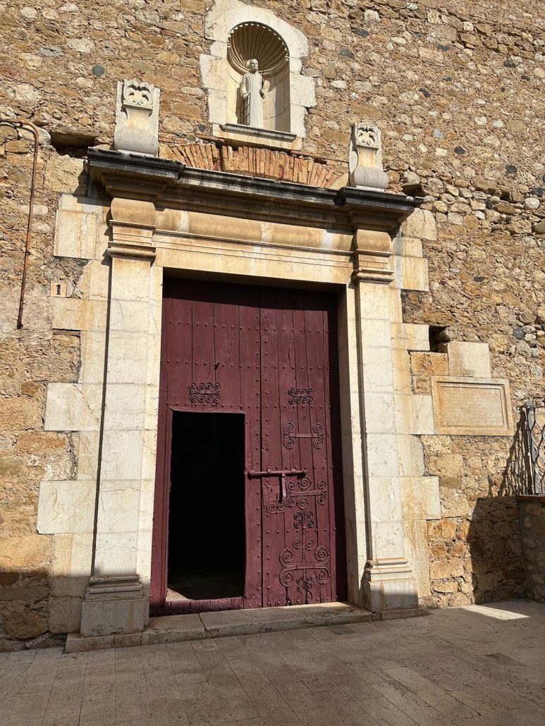 Es va explicar que en Fernando Casadevall va pagar l’ull de bou de la façana de l’església de Santa Maria per poder tenir llum a l’entrada. Les pedres que envolten la porta són de travertí de la Platja d’Espolla. En Rafel ens va fer notar que en l’absidiola lateral esquerra hi ha el suport de la roda de campanes. Vam entrar a la sagristia on vam poder contemplar un autèntic tresor: la calaixera, ben restaurada i decorada amb incrustacions de fusta de boix.