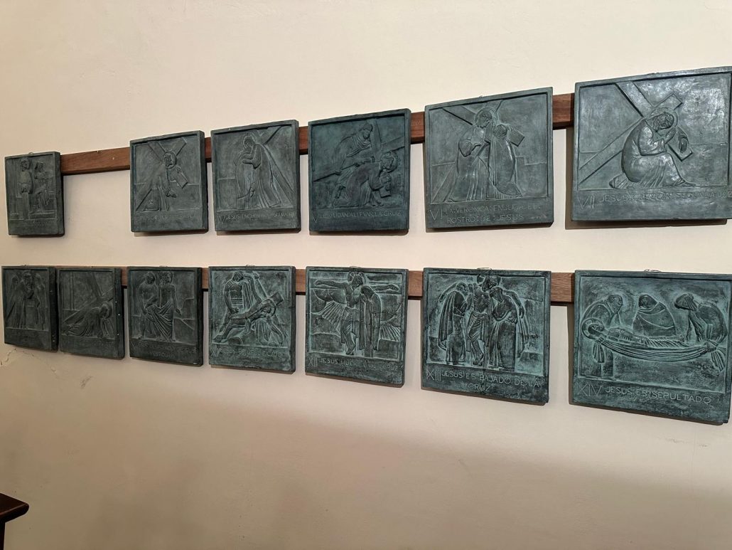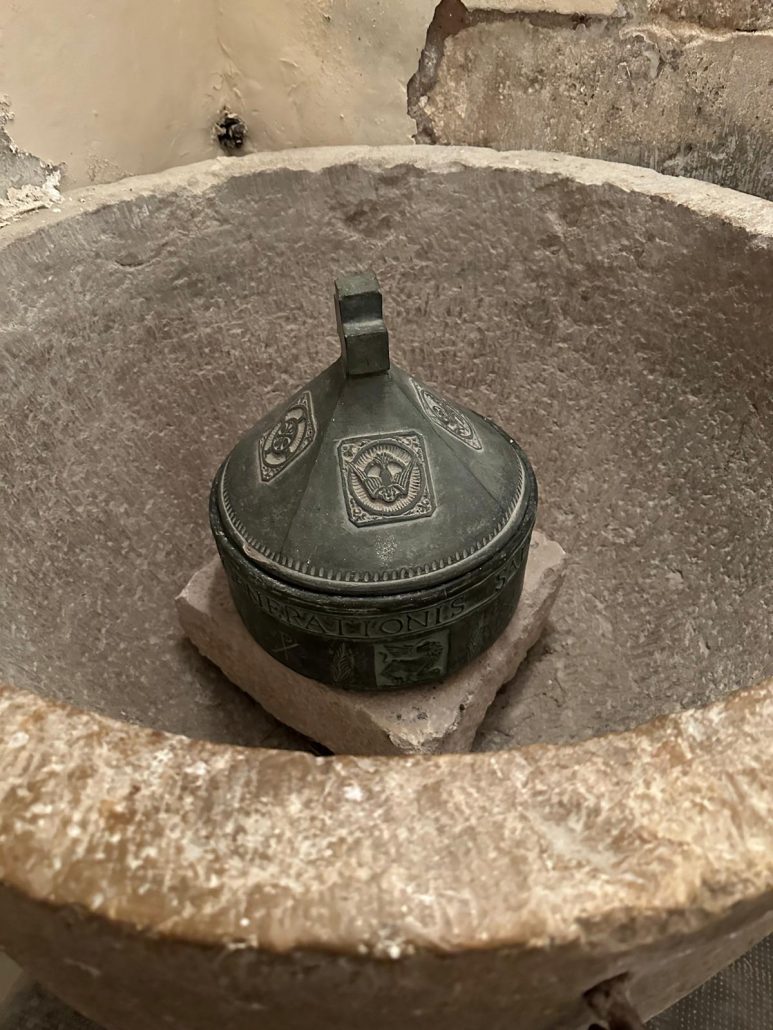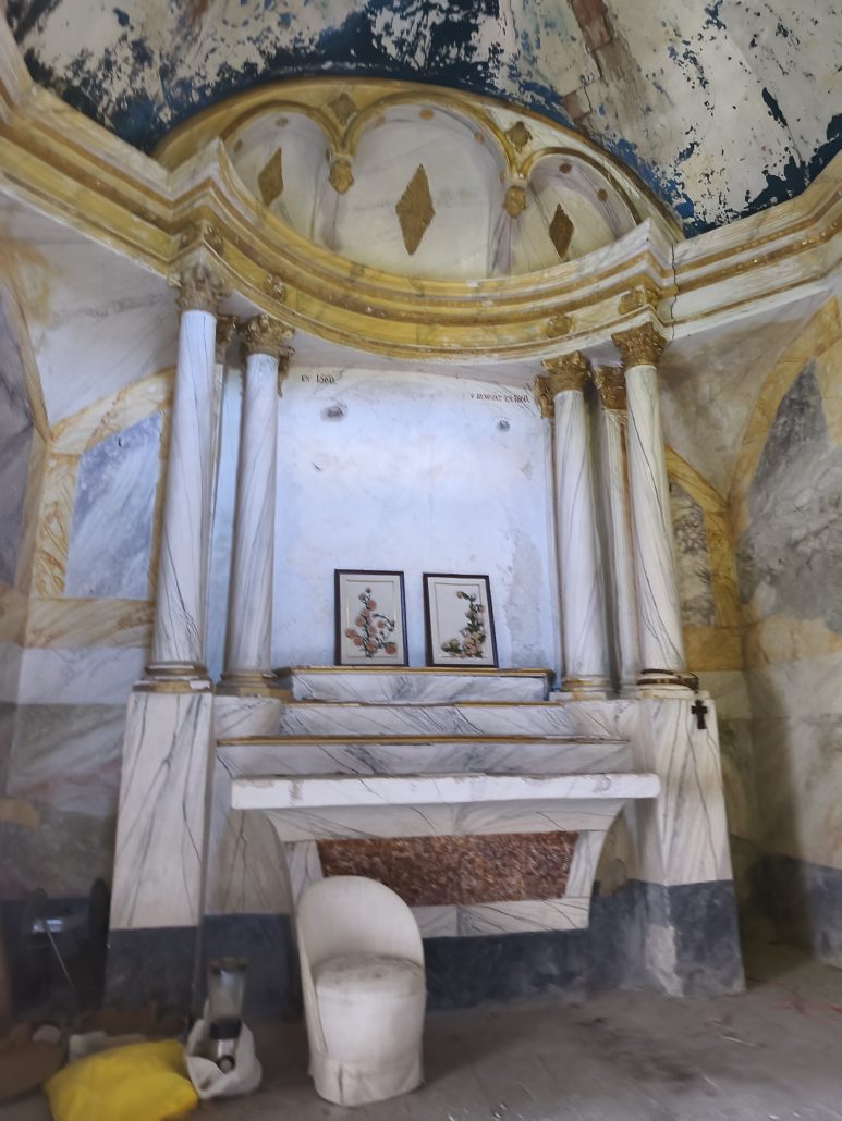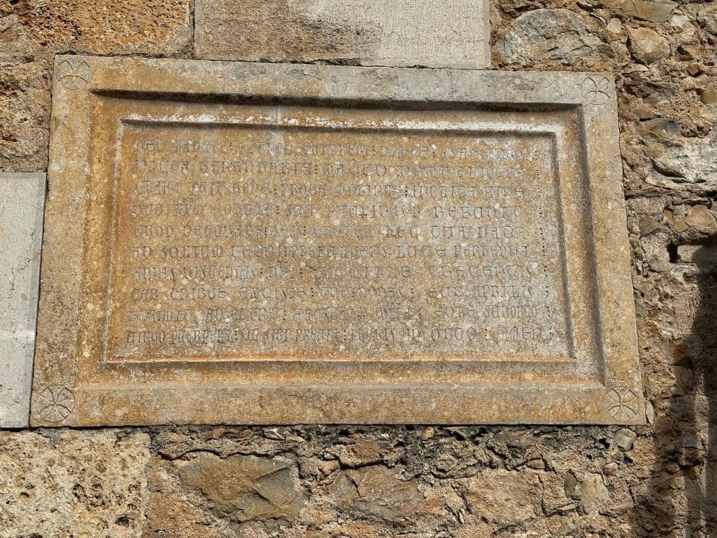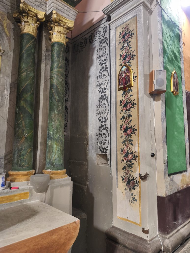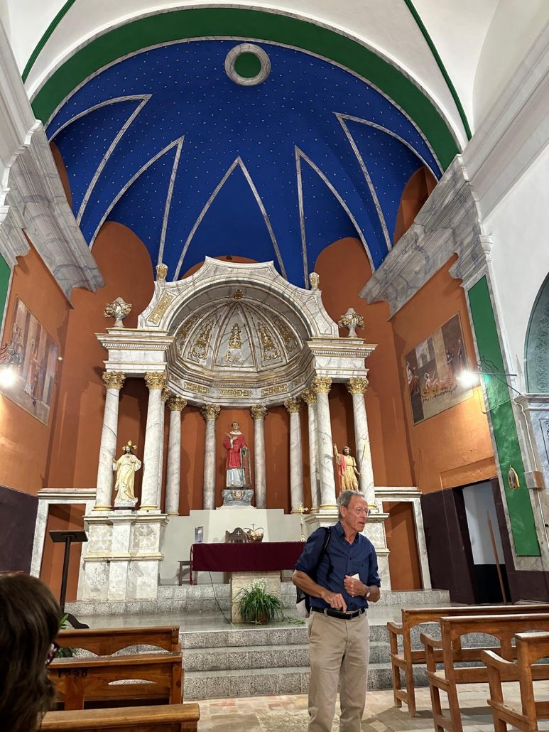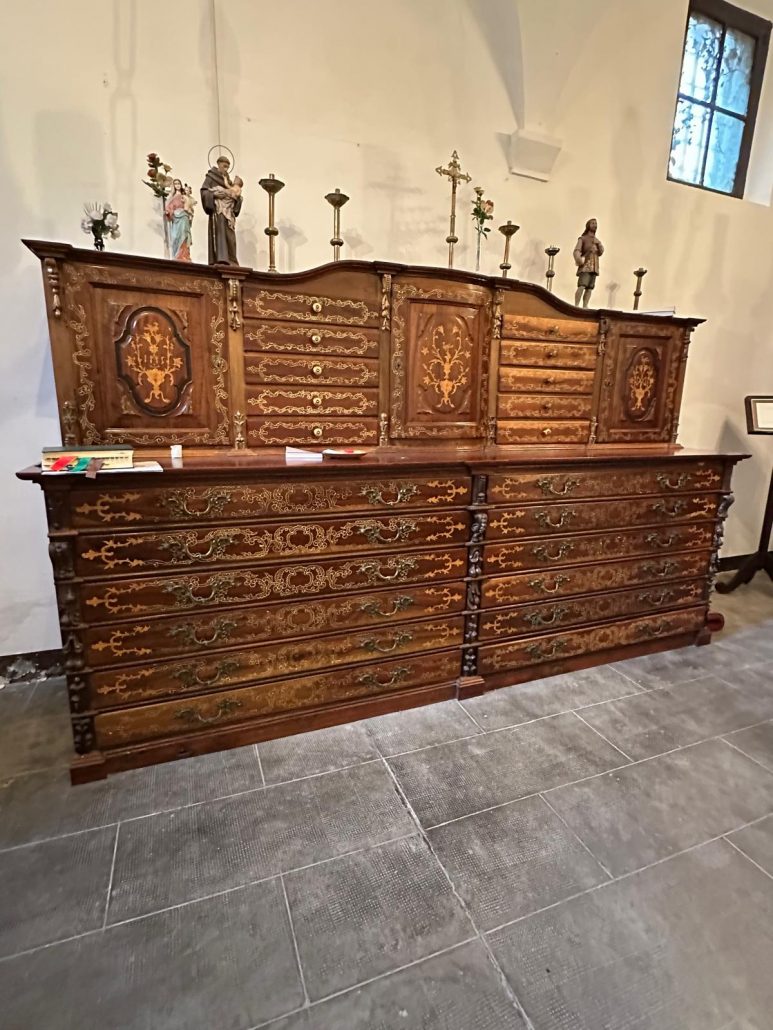 Es va explicar que en Fernando Casadevall va pagar l’ull de bou de la façana de l’església de Santa Maria per poder tenir llum a l’entrada. Les pedres que envolten la porta són de travertí de la Platja d’Espolla. En Rafel ens va fer notar que en l’absidiola lateral esquerra hi ha el suport de la roda de campanes. Vam entrar a la sagristia on vam poder contemplar un autèntic tresor: la calaixera, ben restaurada i decorada amb incrustacions de fusta de boix.