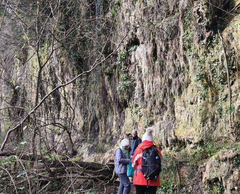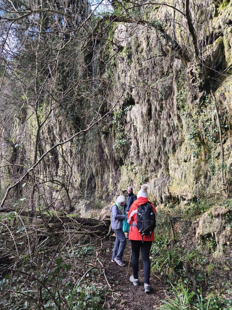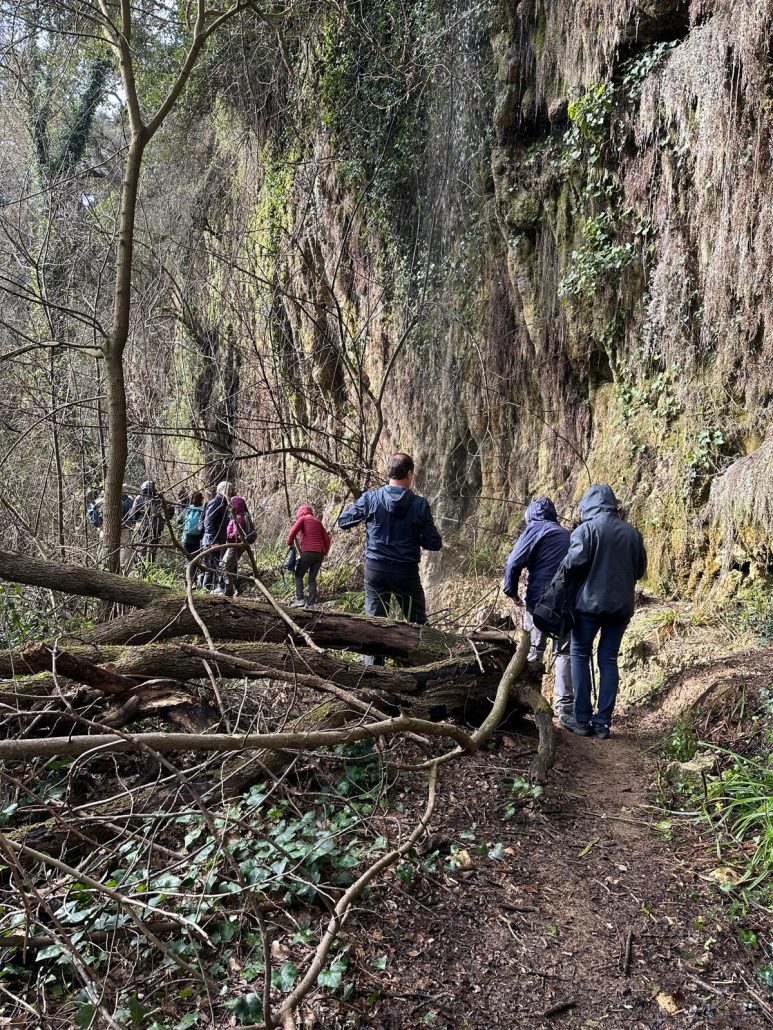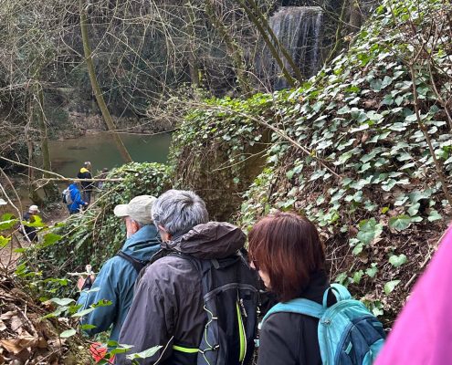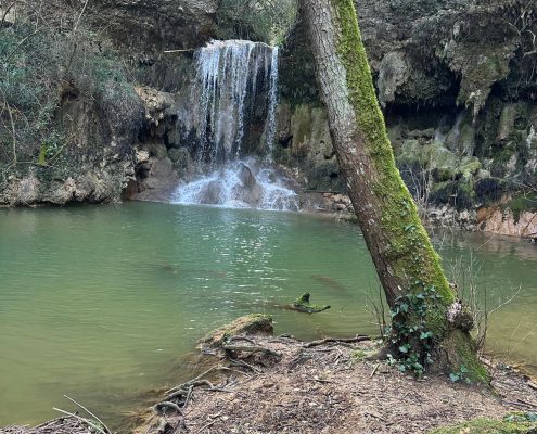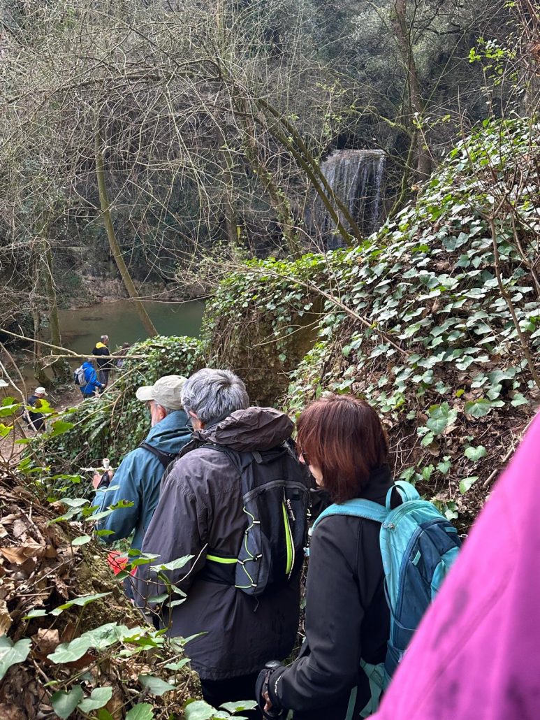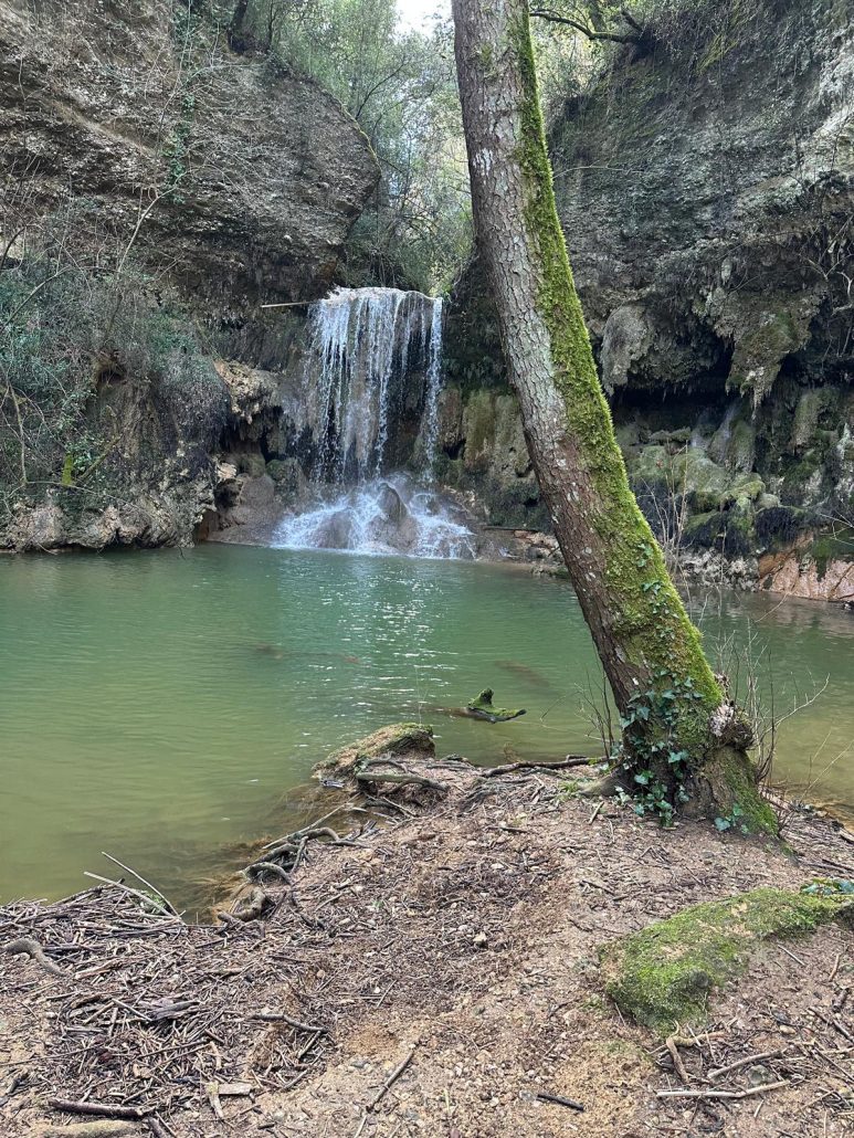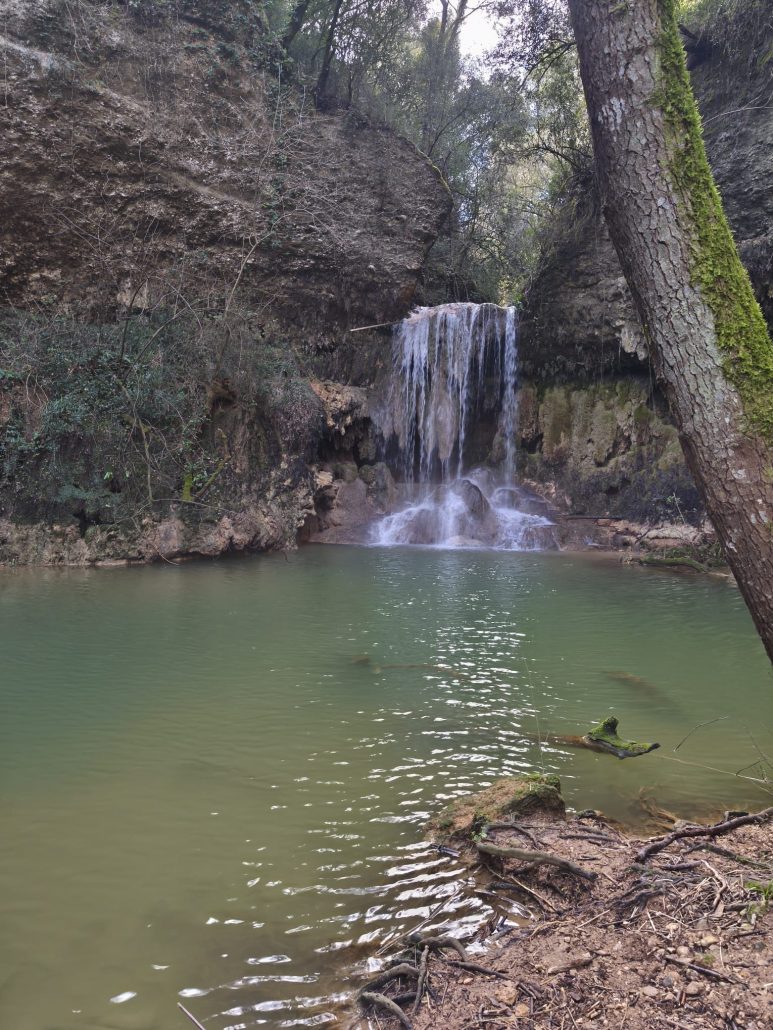 A continuació vam agafar la carretera en direcció nord i el trencall per arribar a Can Barrera i vam seguir pel corriol per anar al Gorg Blau. Primer vam trobar una bonica bauma i tot seguit vam veure una cortina fina d’aigua que queia del cim, fins arribar a mullar-nos en algun punt. El Gorg Blau era ple d’aigua i amb una bona cascada al fons, una imatge espectacular. Vam tornar pel mateix camí fins a Can Barrera, i vam continuar la ruta, tot veient cases aïllades, la majoria habitades, a prop del camí.
