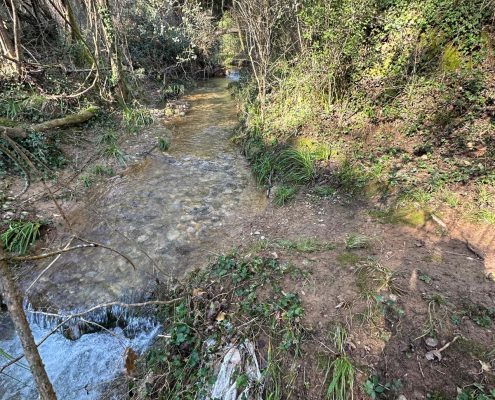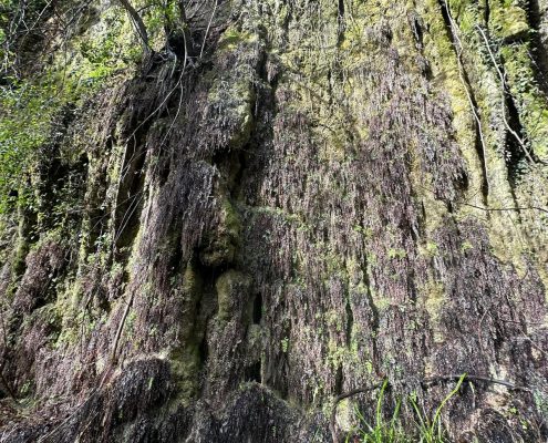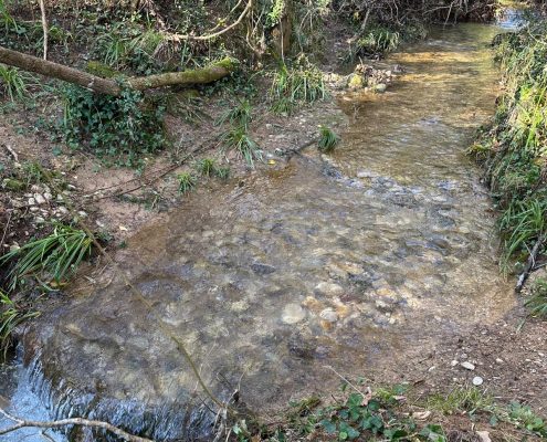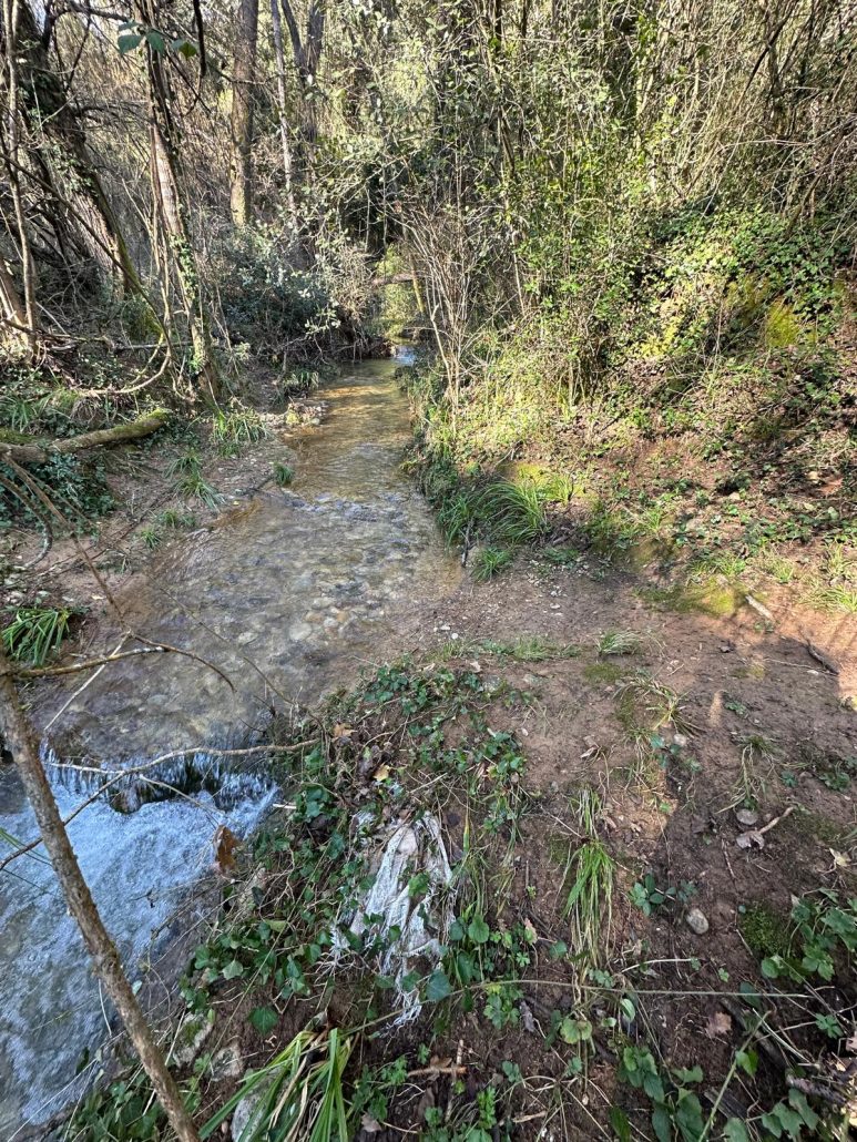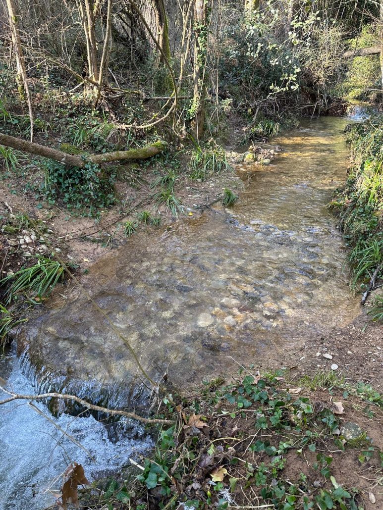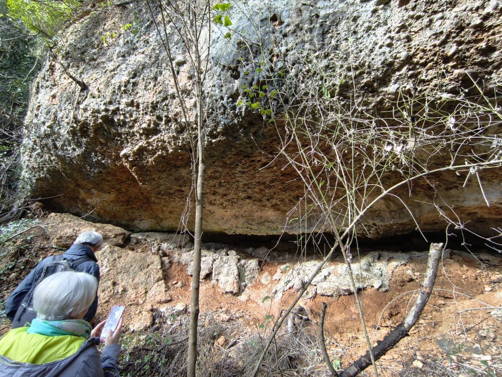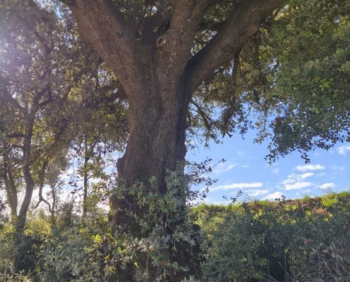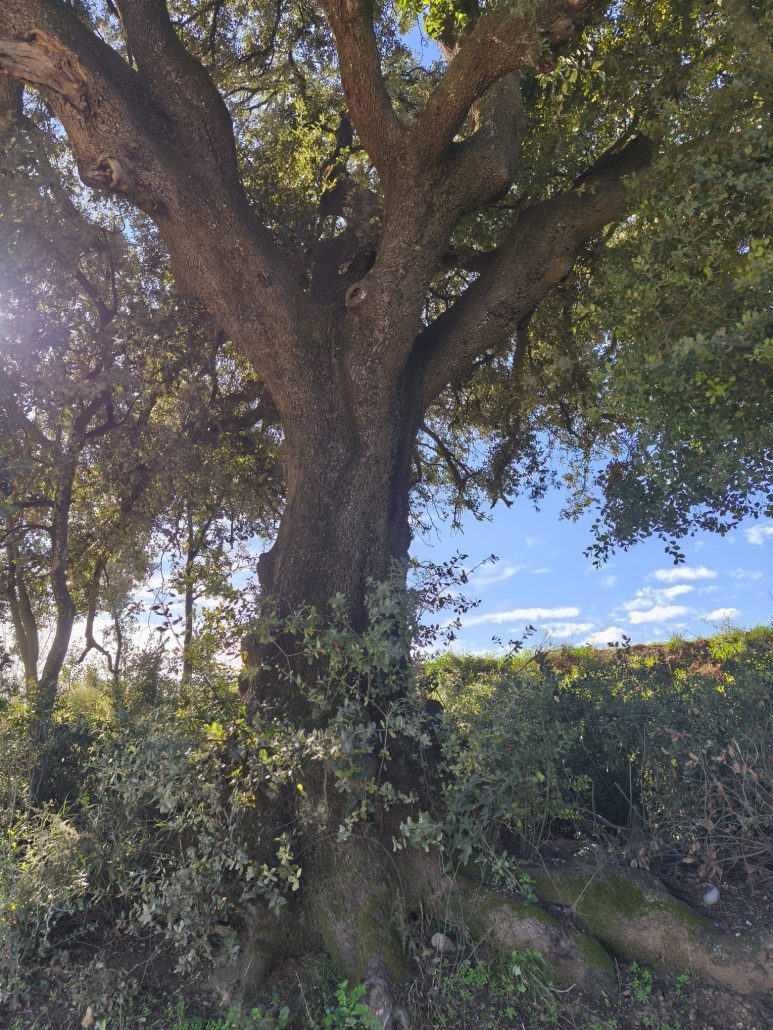 Vam arribar a una cruïlla de camins, on hi ha una aulina amb nom: l’Alzina Grossa de la Serra. Vam tornar a agafar un camí de terra que ens va dur fins al rec del Ramirol, que vam creuar pel Pas de les Eugues. Més amunt, l’aigua corria pel camí: era la de la font de la Bogeria, d’on sortia un bon raig d’aigua.